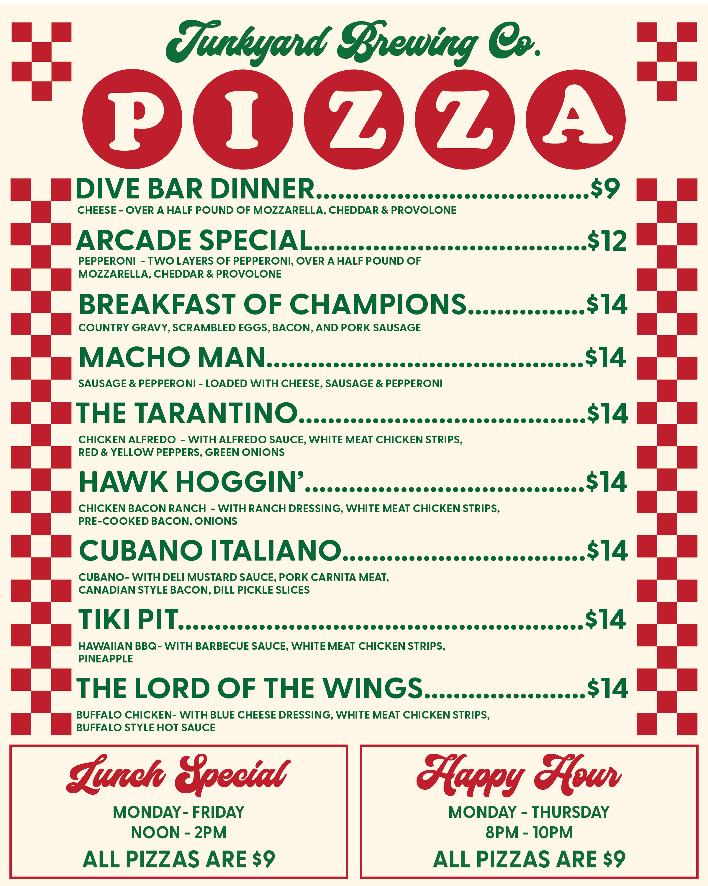 Lunch Special$9 PizzasMonday - Friday Noon - 2pm Happy Hour$9 PizzasMonday - Thursday8:00pm - 10:00pm